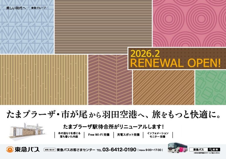 空港連絡バス「たまプラーザ駅・市が尾駅-羽田空港」は、たまプラーザ駅待合所をリニューアルしたのち、2026年2月より運行時刻を変更いたします。これからも、輸送の安全確保とサービス向上に取り組んで参りますので引き続きご愛顧賜りますようよろしくお願いいたします。