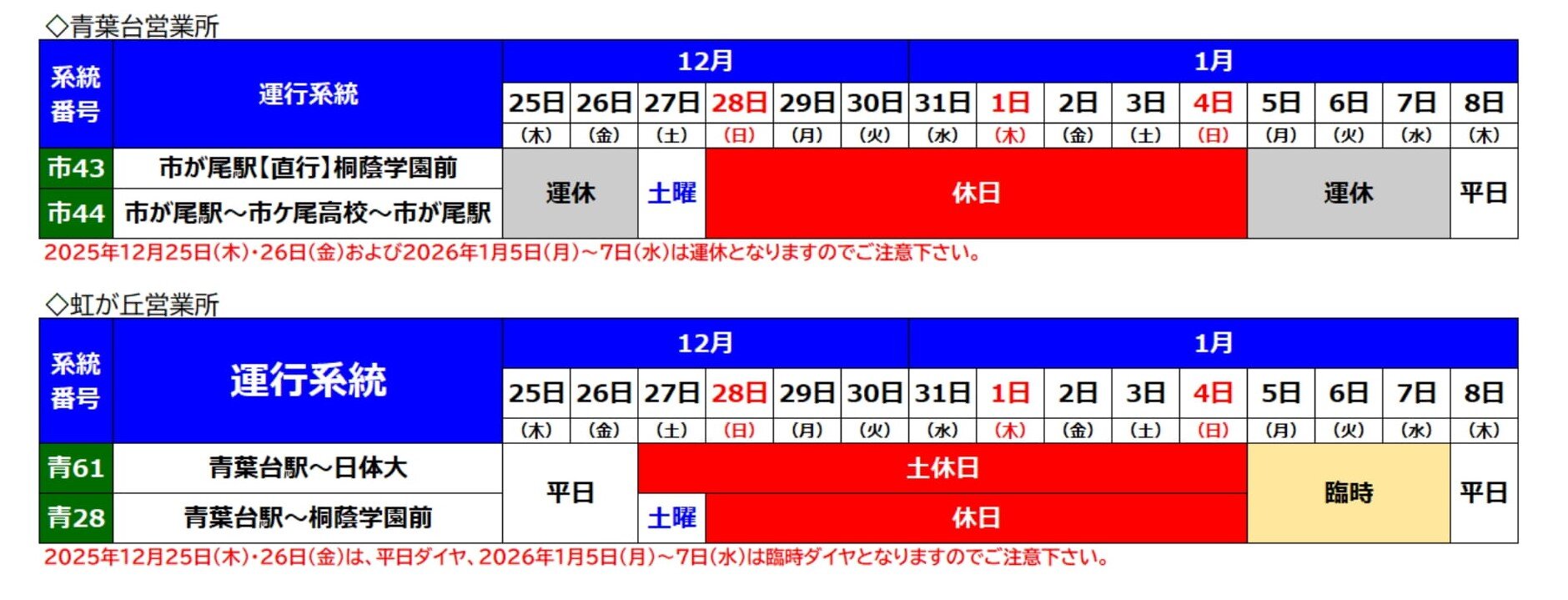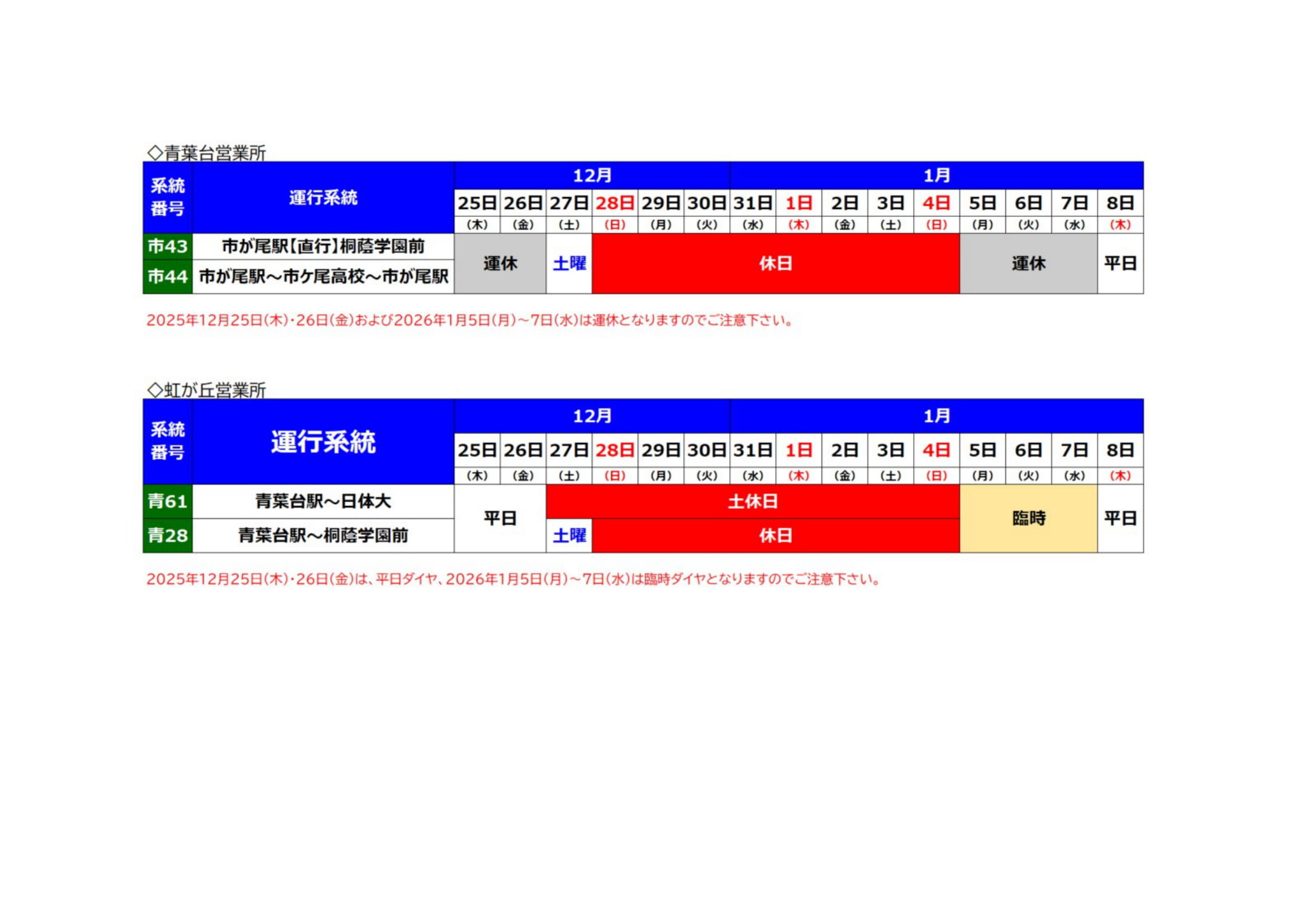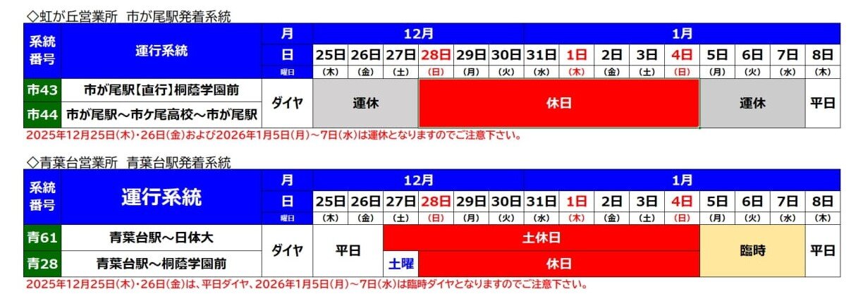 本日も東急バスをご利用いただきましてありがとうございます。沿線学校の冬季休校ともない青葉台営業所、虹が丘営業所の以下の路線は「運休」・「臨時ダイヤ」で運行となりますのでご利用の際はご確認のうえご利用をお願いいたします。