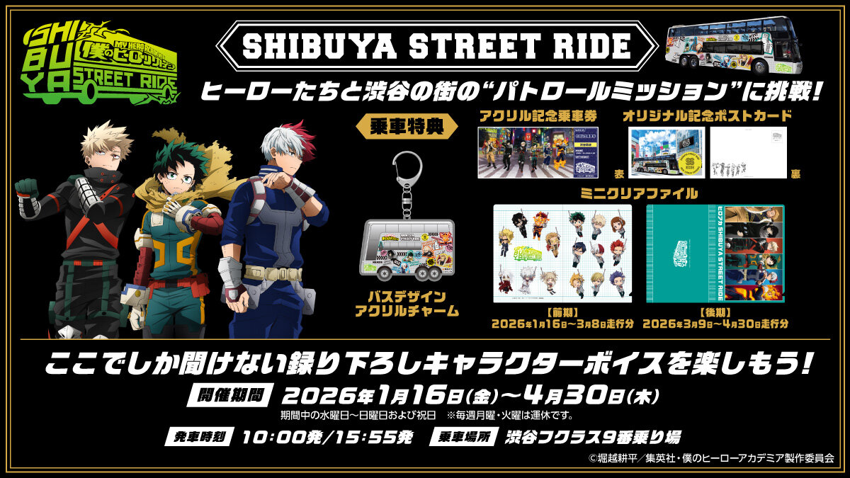 東急グループでは、TVアニメ『僕のヒーローアカデミア』の放送完結を記念して、2026年1月から、渋谷のまちを中心にさまざまなコラボレーション企画を開催します。東急バスでは渋谷を走行する屋根のない2階建てオープントップバス「SHIBUYA STREET RIDE」を期間限定で「僕のヒーローアカデミア」仕様にて運行いたします。ここでしか聞けない緑谷・爆豪・轟の録り下ろしキャラクターボイスに加えて、豪華な乗車特典をお楽しみいただけます。ぜひご利用ください!