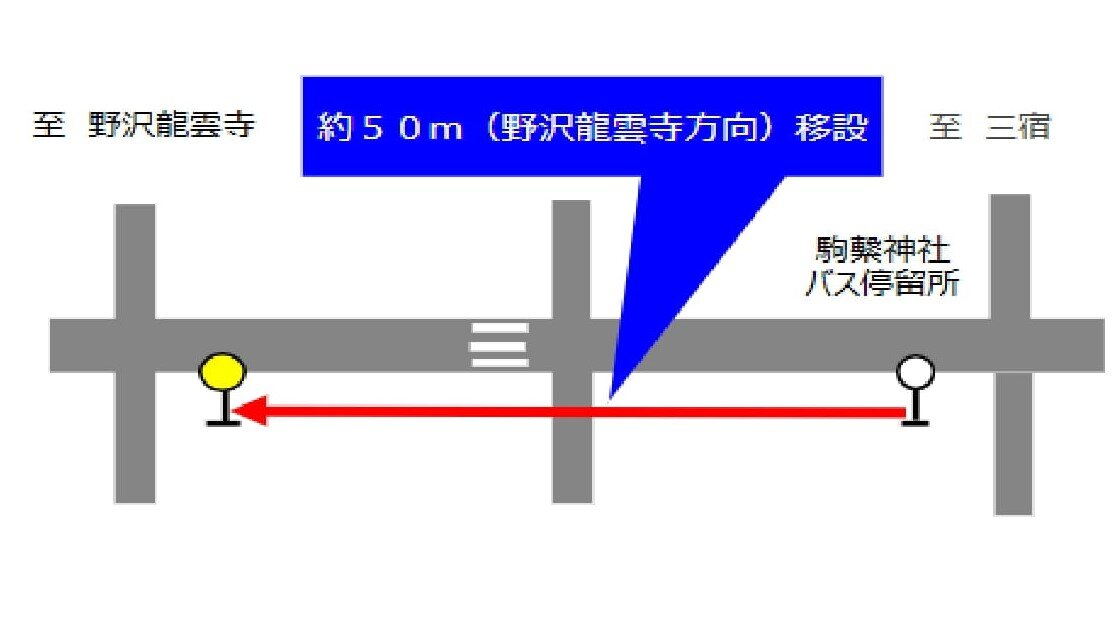2025年12月23日(火)12時00分頃より、野沢龍雲寺方向『駒繋神社』バス停を約50m前方へ当面の間移設いたします。ご利用のお客様にはご不便をおかけいたしますがご了承のうえご利用をお願いいたします。