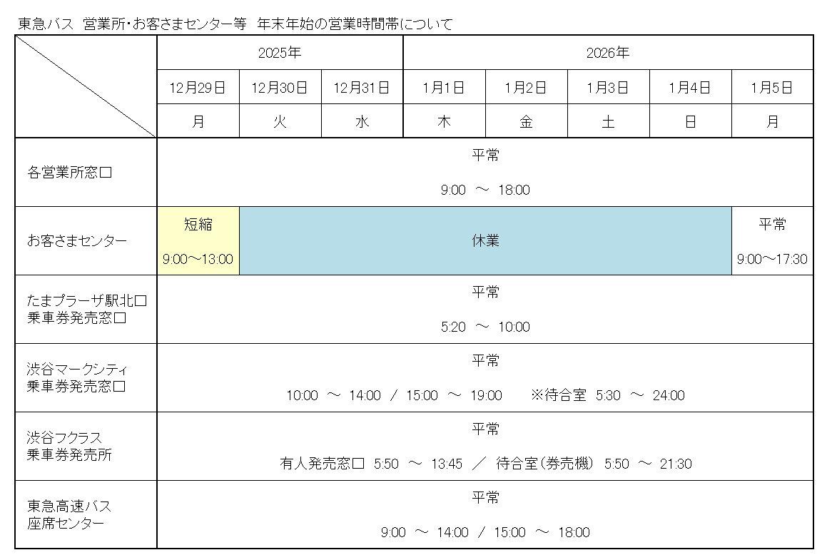 なお、ホームページからのお問い合わせにつきましては、2026年1月5日(月)以降の返信とさせていただきますので、お忘れ物などお急ぎのご用件は、お近くの営業所へお電話にてお問い合わせくださいますようお願いいたします。