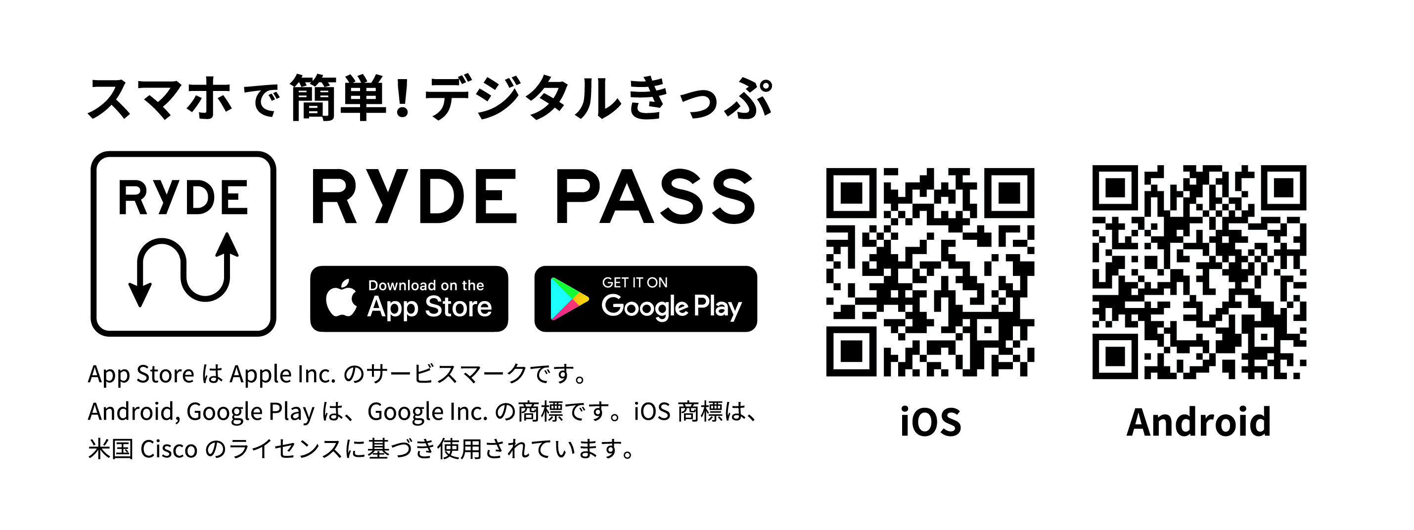 スマホ回数券は電子チケットスマホアプリ「RYDE PASS(ライドパス)」でのみ発売いたします。ご利用のスマートフォンから下のQRコードを読み取り、RYDE株式会社提供アプリ(無料)をダウンロードしてください。乗車券の購入にはクレジットカードが必要です。