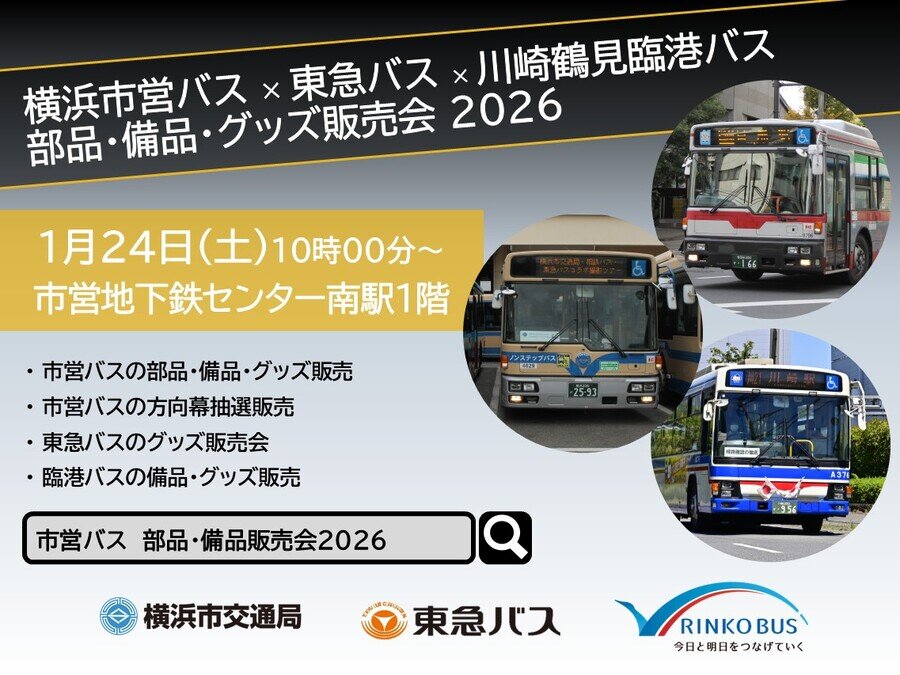 2026年1月24日(土)横浜市営地下鉄センター南駅1階イベントスペースにて、横浜市交通局主催の「横浜市営バス×東急バス×川崎鶴見臨港バス 部品・備品・グッズ販売会2026」が開催されます。