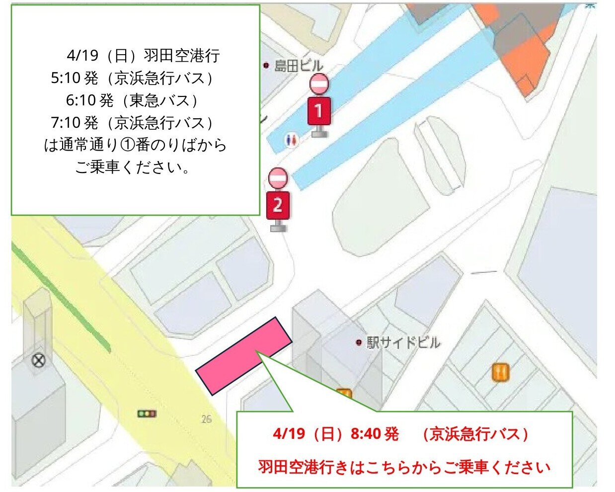 ・当日の5:10発(京浜急行バス) 6:10(東急バス) 7:10(京浜急行バス)発 羽田空港行きは、①番のりばより通常通り運行いたしますが、8:40(京浜急行バス)発の羽田空港行きは臨時のりばより運行いたします。