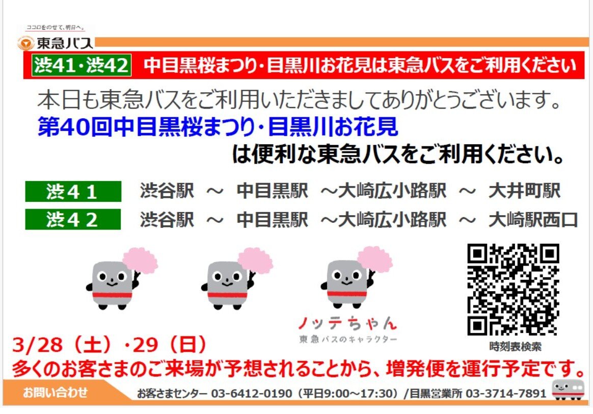 ・3/28(土)・29(日)は東急東横線「中目黒駅」は大変混雑が予想されていますのでバスのご利用もご検討ください。