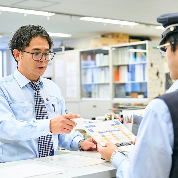 営業所職員として運行管理、労務管理、ダイヤ改正を担当しています。今までの自分の経験が活きていると感じますし、しっかり休みも取れるようになりました。
