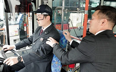 小型のセンサーを運転者と車両に装着し、GPSと組み合わせて計測したデータにより、運転傾向の客観的把握と評価を可能とする運転技能評価システム「Objet(オブジェ)GV」を導入しています。教育センターでの研修のほか、各営業所での乗務員教育に活用しており、営業所や路線ごとに異なる走行環境や速度に即したきめ細かい教育・指導を行うことが可能となります。